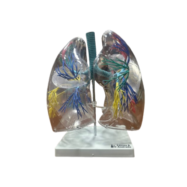 Modelo anatômico dos pulmões, confeccionado em plástico transparente, evidencia brônquios e ramificações brônquicas, colorido didaticamente para estudo e demonstração. Pulmões confeccionado em plástico transparente e traqueia e árvore brônquica em resina plástica.